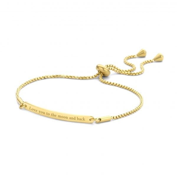 De armband is vervaardigd uit hoogwaardig edelstaal en heeft een plaat met een lieve tekst. De armband is verstelbaar in diverse lengtes door de schuifbead. De armband is verkrijgbaar in 2 kleuren, goud en zilver.