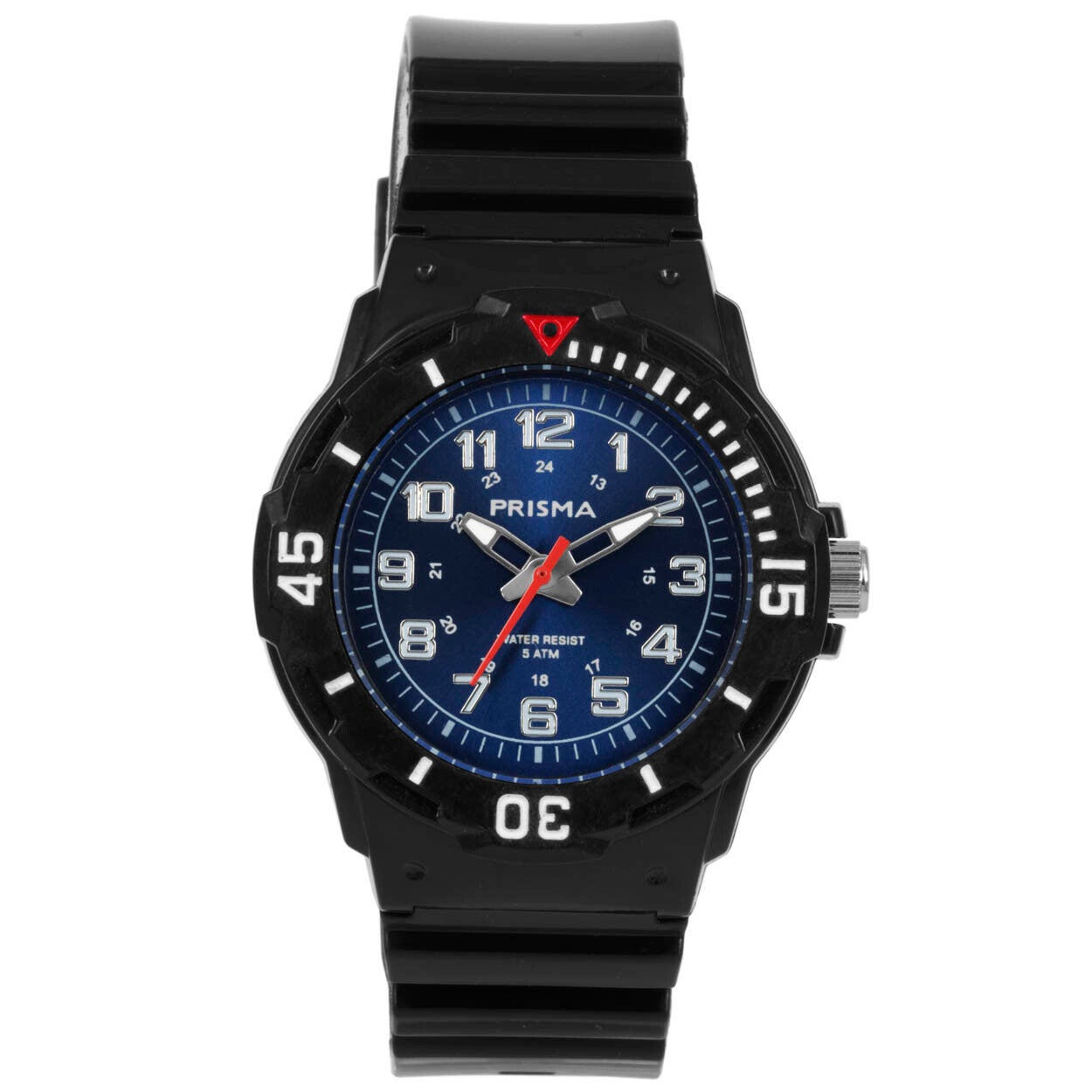 – Wijzerplaat: blauw met zilvere cijfers (arabisch)
