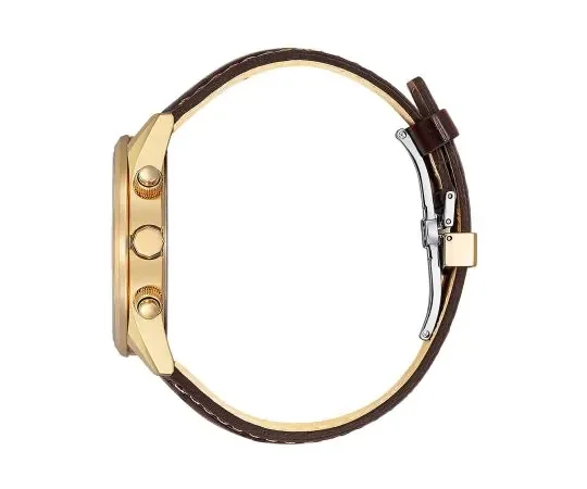 De elegante goudkleurige kast, het krasbestendige saffierglas en de luxe donkerbruine lederen band geven het horloge een tijdloze en hoogwaardige uitstraling. De grijs‑antraciete wijzerplaat met gouden accenten maakt het geheel compleet en zorgt voor een moderne, krachtige look.